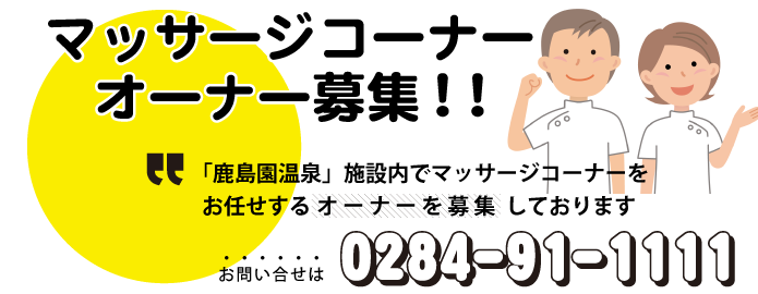 | マッサージコーナー オーナー募集!! 鹿島園温泉 施設内でマッサージコーナーをおまかせするオーナーを募集しております。 詳細はお問い合せください。 TEL 0284-91-1111 |