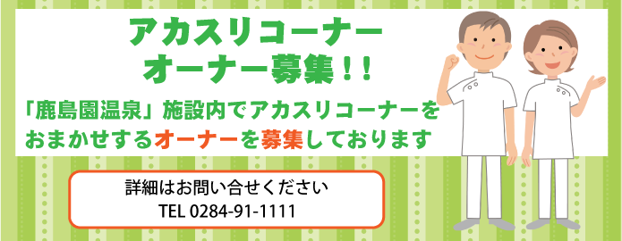 | アカスリコーナー オーナー募集!! 鹿島園温泉 施設内でアカスリコーナーをおまかせするオーナーを募集しております。 詳細はお問い合せください。 TEL 0284-91-1111 |